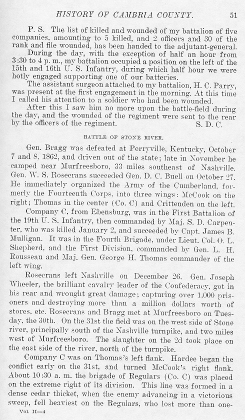 Gen. Bragg was defeated at Perryville, Kentucky, October 7 and *, 1862, and driven out of the state; late in November he camped near Murfreesboro, 33 miles southeast of Nashville. Gen. W.S. Rosecrans succeeded Gen. D.C .Buell on October 27. He immediately organized the Army of the Cumberland, formerly the Fourteenth Corps, into three wings: McCook on the right; Thomas in the center (Co. C) and Crittenden on the left. Company C, from Ebensburg, was in the First Battalion of the 19th U. S. Infantry, then commanded by Maj. S.D. Carpenter, who was killed January 2, and succeeded by Capt. James B. Mulligan. It was in the Fourth Brigade, under Lieut. Col. O.L. Shepherd, and the First Division, commanded by Gen. L. H. Rousseau and Maj. Gen. George H. Thomas commander of the left wing. Rosecrans left Nashville on December 26. Gen. Joseph Wheeler, the brilliant cavalry leader of the Confederacy, got in his rear and wrought great damage; capturing over 1,000 prisoners and destroying more than a million dollars worth of stores etc. Rosecrans and Bragg met at Murfreesboro on Tuesday, the 30th. On the 31st the field was on the west side of Stone river, principally south of the Nashville turnpike, and two miles west of Murfreesboro. The slaughter on the 2d took place on the east side of the river, north of the turnpike. Company C was on Thomas's left flank. Hardee began the conflict early on the 31st, and turned McCook's right flank. About 10:30 a.m. the brigade of Regulars (Co. C) was placed on the extreme right of its division. This line was formed in a dense cedar thicket, when the enemy advancing in a victorious sweep, fell heaviest on the Regulars, who lost more than one- |