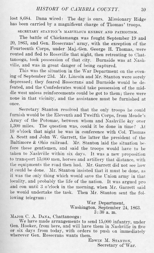 The battle of Chickamauga was fought September 19 and 20, 1863, and Gen. Rosecrans' army, with the exception of the Fourteenth Corps, under Maj.-Gen. George H. Thomas, were routed and fled to Rossville that night, then retreating to Chattanooga, took possession of that city. Burnside was at Nashville, and was in great danger of being captured. This was the situation in the War Department on the evening of September 23d. Mr. Lincoln and Mr. Stanton were sorely depressed, they feared Rosecrans and Burnside would be defeated, and the Confederates would take possession of the middle west unless reinforcements could be got to them; there were none in that vicinity, and the assistance must be furnished at once. Secretary Stanton resolved that the only troops he could furnish would be the Eleventh and Twelfth Corps, from Meade's Army of the Potomac, between whom and Nashville lay over 1,300 miles. The question was, could it be done in time? At 10 o'clock that night he was in conference with Col. Thomas A. Scott and John W. Garrett, the latter the president of the Baltimore & Ohio railroad. Mr. Stanton laid the situation before these gentlemen, and said the troops would have to be taken to Nashville within six days. It was a new proposition to transport 15,000 men, horses and artillery that distance, with the equipments the road then had. Mr. Garrett did not see how it could be done. Mr. Stanton insisted that it must be done, as it was the only thing which would save the Union army in that locality, and probably the life of the nation. It was argued pro and con until 3 o'clock in the morning, when Mr. Garrett said he would undertake the task. Then Mr. Stanton sent the following telegram: War Department,