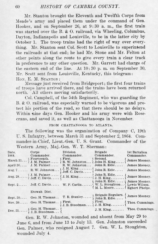 Mr. Stanton brought the Eleventh and Twelfth Corps from Meade's army and placed them under the command of Gen. Hooker, and on September 26, at 9:30 a. m., the first train was started over the B. & O. railroad, via Wheeling, Columbus, Dayton, Indianapolis and Louisville, to be in the latter city by October 1. The troop trains had the right of way over everything. Mr. Stanton sent Col. Scott to Louisville to superintend the railroads at that end; he had Mr. Stone and Mr. Felton at other points along the route to give every train a clear track in preference to any other question. Mr. Garrett had charge of the eastern end of the line. At 10:30 p. m. on September 30, Mr. Scott sent from Louisville, Kentucky, this telegram: HON. E. M. STANTON: Message just received from Bridgeport; the first four trains of troops have arrived there, and the trains have been returned north. All others moving satisfactorily. Col. Campbell, of the 54th Regiment, who was guarding the B. & O. railroad, was especially warned to be vigorous and protect his portion of the road, so that there should be no delays. Within nine days Gen. Hooker and his army were with Rosecrans, and saved it, as well as Chattanooga in November. FROM CHATTANOOGA TO ATLANTA.