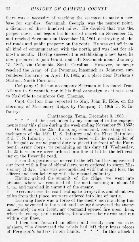 there was a necessity of reaching the seacoast to make a new base for supplies. Savannah, Georgia, was the nearest point, a distance of three hundred miles. He decided that was the proper move, and began his historical march on November 15, and reached Savannah on December 10, 1864, destroying all the railroads and public property on the route. He was cut off from all kind of communication with the north, and was lost for almost a month. Having succeeded in establishing a new base, he now prepared to join Grant, and left Savannah about January 15, 1865, via Columbia, South Carolina. However, he never reached the Army of the Potomac, inasmuch as Johnston surrendered his army on April 18, 1865, at a place near Durham's Station, North Carolina. Company C did not accompany Sherman in his march from Atlanta to Savannah, nor in his final campaign, as it was sent to Nashville to reinforce Gen. Thomas. Capt. Crefton thus reported to Maj. John R. Edie, on the storming of Missionary Ridge, by Company C, 19th U. S. Infantry: Chattanooga, Tenn., December 3, 1963.
