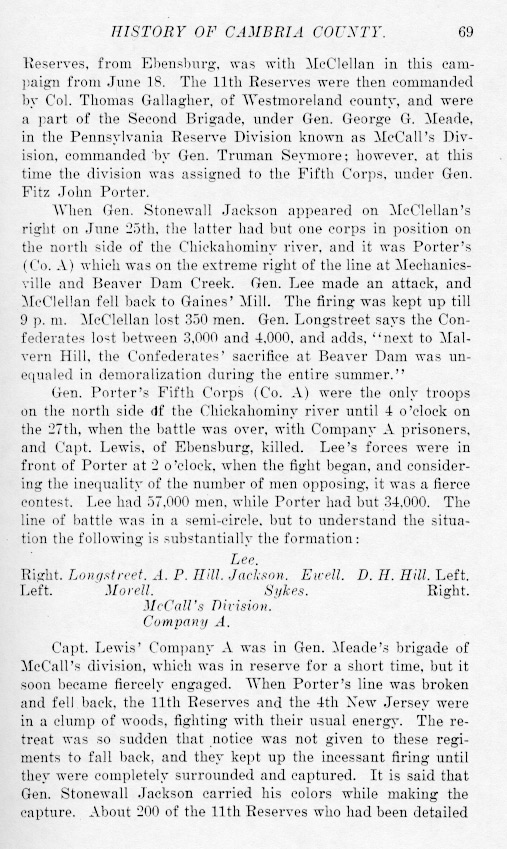 Reserves, from Ebensburg, was with McClellan in this campaign from June 18. The 11th Reserves were then commanded by Col. Thomas Gallagher, of Westmoreland county, and were a part of the Second Brigade, under Gen. George G. Meade, in the Pennsylvania Reserve Division known as McCall's Division, commanded by Gen. Truman Seymore; however, at this time the division was assigned to the Fifth Corps, under Gen. Fitz John Porter. When Gen. Stonewall Jackson appeared on McClellan's right on June 25th, the latter had but one corps in position on the north side of the Chickahominy river, and it was Porter's (Co. A) which was on the extreme right of the line at Mechanicsville and Beaver Dam Creek. Gen. Lee made an attack, and McClellan fell back to Gaines' Mill. The firing was kept up till 9 p.m. McClellan lost 350 men. Gen. Longstreet says the Confederates lost between 3,000 and 4,000, and adds, “next to Malvern Hill, the Confederates' sacrifice at Beaver Dam was unequaled in demoralization during the entire summer.” Gen. Porter's Fifth Corps (Co. A) were the only troops on the north side of the Chickahominy river until 4 o'clock on the 27th, when the battle was over, with Company A prisoners, and Capt. Lewis, of Ebensburg, killed. Lee's forces were in front of Porter at 2 o'clock, when the fight began, and considering the inequality of the number of men opposing, it was a fierce contest. Lee had 57,000 men, while Porter had but 34,000. The line of battle was in a semi-circle, but to understand the situation the following is substantially the formation: