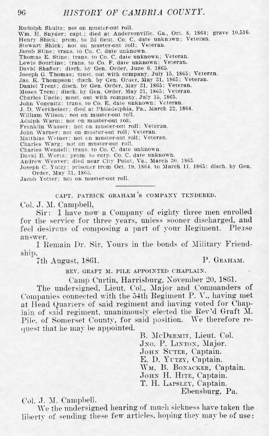 The undersigned, Lieut. Col., Major and Commanders of Companies connected with the 54th Regiment P. V., having met at Head Quarters of said regiment and having voted for Chaplain of said regiment, unanimously elected the Rev'd Graft M. Pile, of Somerset County, for said position. We therefore request that he may be appointed.