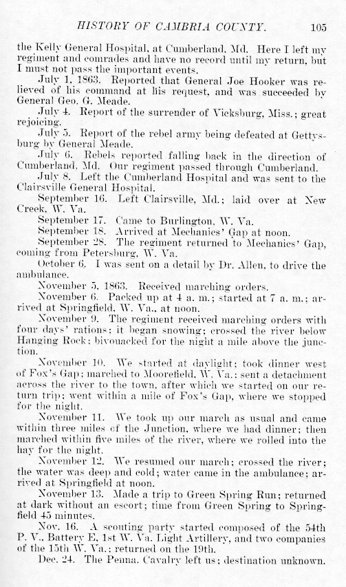the Kelly General Hospital, at Cumberland, Md. Here I left my regiment and comrades and have no record until my return, but I must not pass the important events. July 1, 1863. Reported that General Joe Hooker was relieved of his command at his request, and was succeeded by General Geo. G. Meade. July 4. Report of the surrender of Vicksburg, Miss.; great rejoicing. July 5. Report of the rebel army being defeated at Gettysburg by General Meade. July 6. Rebels reported falling back in the direction of Cumberland, Md. Our regiment passed through Cumberland. July 8. Left the Cumberland Hospital and was sent to the Clairsville General Hospital. September 16. Left Clairsville, Md.; laid over at New Creek, W. Va. September 17. Came to Burlington, W. Va. September 18. Arrived at Mechanics' Gap at noon. September 28. The regiment returned to Mechanics' Gap, coming from Petersburg, W. Va. October 6. I was sent on a detail by Dr. Allen, to drive the ambulance. November 5, 1863. Received marching orders. November 6. Packed up at 4 a. m.; started at 7 a. m.; arrived at Springfield, W. Va., at noon. November 9. The regiment received marching orders with four days' rations; it began snowing; crossed the river below Hanging Rock; bivouacked for the night a mile above the junction. November 10. We started at daylight; took dinner west of Fox's Gap; marched to Moorefield, W. Va.; sent a detachment across the river to the town, after which we started on our return trip; went within a mile of Fox's Gap, where we stopped for the night. November 11. We took up our march as usual and came within three miles of the Junction, where we had dinner; then marched within five miles of the river, where we rolled into the hay for the night. November 12. We resumed our march; crossed the river; the water was deep and cold; water came in the ambulance; arrived at Springfield at noon. November 13. Made a trip to Green Spring Run; returned at dark without an escort; time from Green Spring to Springfield 45 minutes. November 16. A scouting party started composed of the 54th P. V., Battery E, 1st W. Va. Light Artillery, and two companies of the 15th W. Va.; returned on the 19th. Dec. 24. The Penna. Cavalry left us; destination unknown. |