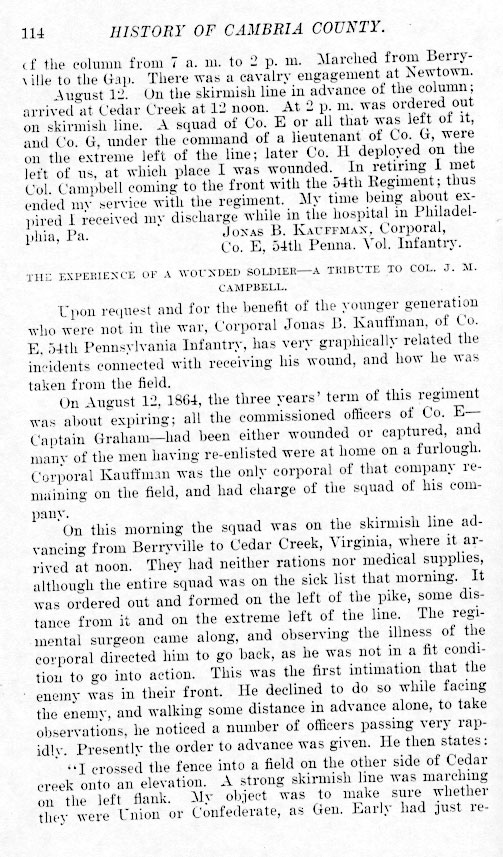 CAMPBELL Upon request and for the benefit of the younger generation who were not in the war, Corporal Jonas B. Kauffman, of Co. E, 54th Pennsylvania Infantry, has very graphically related the incidents connected with receiving his wound, and how was has taken from the field. On August 12, 1864, the three years' term of this regiment was about expiring; at the commissioned officers of Co. E — Captain Graham — had been either wounded or captured, and many of the men having re-enlisted were at home on a furlough. Corporal Kauffman was the only corporal of that company remaining on the field, and had charge of the squad of his company. On the morning the squad was on the skirmish line advancing from Berryville to Cedar Creek, Virginia, where it arrived at noon. They had neither rations or medical supplies, although the entire squad was on the sick list that morning. It was ordered out and formed on the left of the pike, some distance from it and on the extreme left of the line. The regimental surgeon came along, and observing the illness of the corporal directed him to go back, as he was not in a fit condition to go into action. This was the first intimation that the enemy was in their front. He declined to do so while facing the enemy, and walking some distance in advance alone, to take observations, he noticed a number of officers passing very rapidly. Presently the order to advance was given. He then states: “I crossed the fence into a field on the other side of Cedar creek onto an elevation. A strong skirmish line was marching on the left flank. My object was to make sure whether they were Union or Confederate, As Gen. Early had just re- |