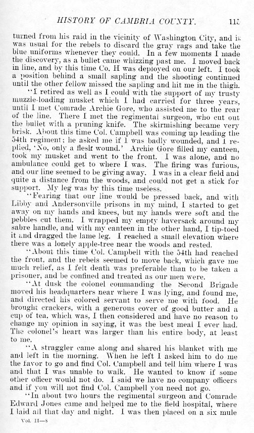 turned from his raid in the vicinity of Washington City, and it was usual for the rebels to discard the gray rags and take the blue uniforms whenever they could. In a few moments I made the discovery, as a bullet came whizzing past me. I moved back in line, and by this time Co. H was deployed on our left. I took a position behind a small sapling and the shooting continued until the other fellow missed the sapling and hit me in the thigh. “I retired as well as I could with support of my trusty muzzle-loading musket which I had carried for three years, until I met Comrade Archie Gore, who assisted me to the rear of the line. There I met the regimental surgeon, who cut out the bullet with a pruning knife. The skirmishing became very brisk. About this time Col. Campbell was coming up leading the 54th regiment; he asked me if I was badly wounded, and I replied, 'No, only a flesh wound.' Archie Gore filled my canteen, took my musket and went to the front. I was alone, and no ambulance could get to where I was. The firing was furious, and our line seemed to be giving away. I was in a clear field and quite a distance from the woods, and could not get a stick for support. My leg was by this time useless. “Fearing that our line would be pressed back, and with Libby and Andersonville prisons in my mind, I started to get away on my hands and knees, but my hands were soft and the pebbles cut them. I wrapped my empty haversack around my sabre handle, and with my canteen in the other hand, I tip-toed it and dragged the lame leg. I reached a small elevation where there was a lonely apple-tree near the woods and rested. “About this time Col. Campbell with the 54th had reached the front, and the rebels seemed to move back, which gave me much relief, as I felt death was preferable than to be taken a prisoner, and be confined and treated as our men were. “At dusk the colonel commanding the Second Brigade moved his headquarters near where I was lying, and found me, and directed his colored servant to serve me with food. He brought crackers, with a generous cover of good butter and a cup of tea, which was, I then considered and have no reason to change my opinion in saying, it was the best meal I ever had. The colonel's heart was larger than his entire body, at least to me. “A straggler cam along and shared his blanket with me and left in the morning. When he left I asked him to do me the favor to go and find Col. Campbell and tell him where I was and that I was unable to walk, He wanted to know if some other officer would not do. I said we have no company officers and if you will not find Col. Campbell you need not go. “In about two hours the regimental surgeon and Comrade Edward Jones came and helped me to the field hospital, where I Iaid all that day and night. I was then placed on a six mule |