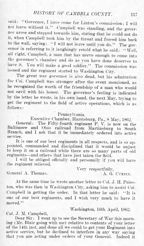 said: “Governor, I have come for Linton's commission: I will not leave without it.” Campbell was standing, and the governor arose and stepped towards him, stating that he could not do it, when Campbell took him by the throat and forced him back to the wall, saying: “I will not leave until you do.” The governor in referring to it laughingly retold what he said: “Well, all right. Campbell, a man that has nerve enough to come into the governor's chamber and do as you have done deserves to have it. You will make a good soldier.” The commission was issued and the regiment started to Washington City. The great war governor is also dead, but his admiration for Col. Campbell was stronger after the event mentioned, as he recognized the worth of the friendship of a man who would not cavil with his honor. The governor's feeling is indicated by the letter he wrote, in his own hand, the next May, trying to get the regiment to the field of active operations, which is as follows: Pennsylvania