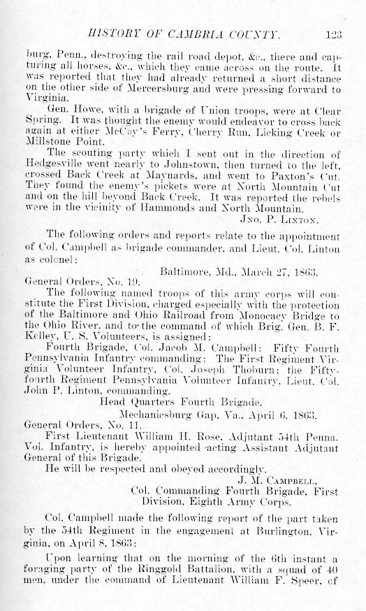 Col. Campbell made the following report of the part taken by the 54th Regiment in the engagement at Burlington, Virginia, on April 8, 1863: Upon learning that on the morning of the 6th instant a foraging party of the Ringgold Battalion, with a squad of 40 men, under the command of Lieutenant William F. Speer, of |