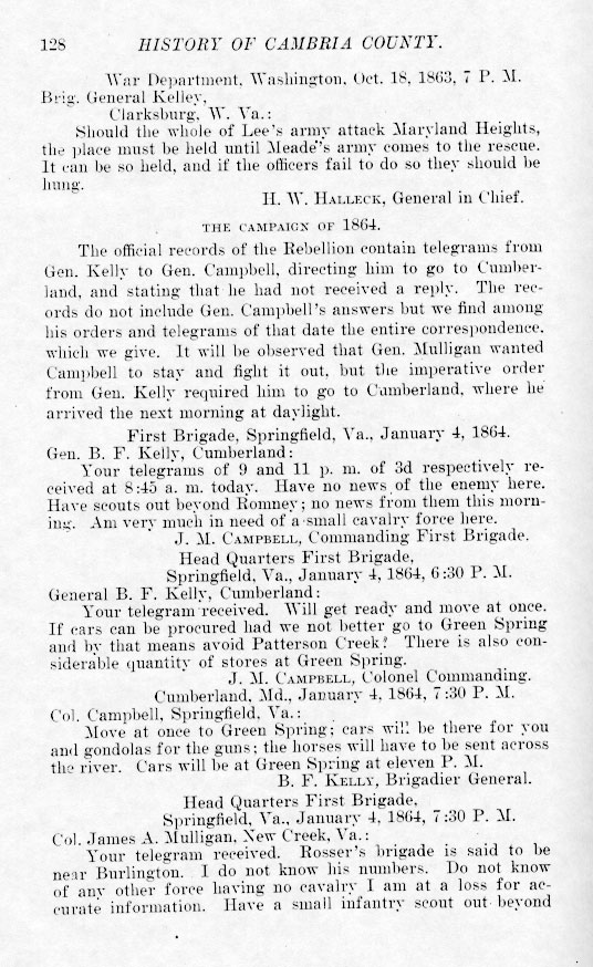 The official records of the Rebellion contain telegrams from Gen. Kelly to Gen. Campbell, directing him to go to Cumberland, and stating that he did not received a reply. The records do not include Gen. Campbell's answers but we find among his orders and telegrams of that date the entire correspondence, which we give. It will be observed that Gen. Mulligan wanted Campbell to stay and fight it out, but the imperative order from Gen. Kelly required him to go to Cumberland, where he arrived the next morning at daylight. First Brigade, Springfield, Va., January 4, 1864.