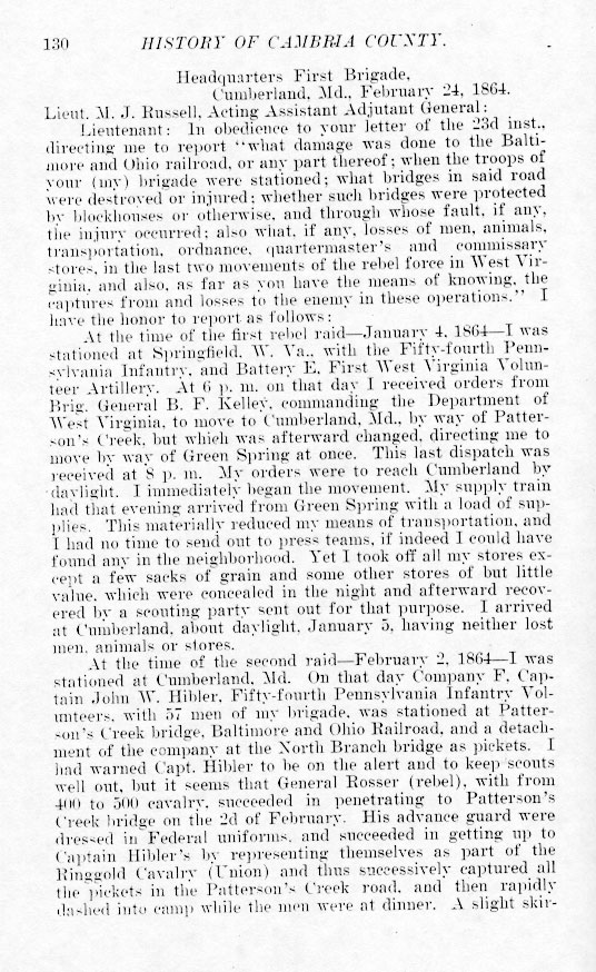 Lieut. M. J. Russell, Acting Assistant Adjutant General:Cumberland, Md., February 24, 1864. Lieutenant: In obedience to your letter of the 23d inst., directing me to report what damage was done to the Baltimore and Ohio railroad, or any part thereof; when the troops of your (my) brigade were stationed; what bridges in said road were destroyed or injured; whether such bridges were protected by blockhouses or otherwise, and through whose fault, if any, the injury occurred; also what, if any, losses of men, animals, transportation, ordnance, quartermaster's and commissary stores, in the last two movements of the rebel force in West Virginia, and also, as far as you have the means of knowing, the captures from and losses to the enemy in these operation, I have the honor to report as follows: At the time of the first rebel raid January 4, 1864 I was stationed at Springfield, W. Va., with the Fifty-fourth Pennsylvania Infantry, and Battery E. First West Virginia Volunteer Artillery. At 6 p. m. on that day I received orders from Brig. General B. F. Kelley, commanding the Department of West Virginia, to move to Cumberland, Md., by way of Patterson's Creek, but which was afterward changed, directing me to move by way of Green Spring at once. This last dispatch was received at 8 p. m. My orders were to reach Cumberland by daylight. I immediately began the movement. My supply train had that evening arrived from Green Spring with a load of supplies. This materially reduced my means of transportation, and I had no time to send out to press teams, if indeed I could have found any in the neighborhood. Yet I took off all my stores except a few sacks of grain and some other stores of but little value, which were concealed in the night and afterward recovered by a scouting party sent out for that purpose. I arrived at Cumberland about daylight, January 5, having neither lost men, animals, or stores. At the time of the second raid February 2, 1864 I was stationed at Cumberland, Md. On that day Company F, Captain John W. Hibler, Fifty-fourth Pennsylvania Infantry Volunteers with 57 men of my brigade, was stationed at Patterson's Creek bridge, Baltimore and Ohio Railroad, and a detachment of the company at the North Branch bridge as pickets. I had warned Capt. Hibler to be on the alert and to keep scouts well out, but it seems that General Rosser (rebel), with from 400 to 500 cavalry, succeeded in penetrating to Patterson's Creek bridge on the 2d of February. His advance guard were dressed in Federal uniforms, and succeeded in getting up to Captain Hibler's by representing themselves as part of the Ringgold Cavalry (Union) and thus successively captured all the pickets in the Patterson's Creek road, and then rapidly dashed into camp while the men were at dinner. A slight skir- |