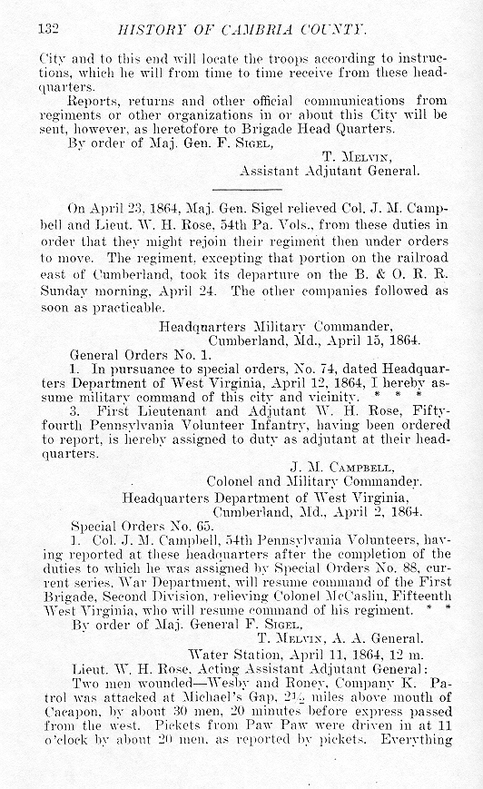 Assistant Adjutant General. On April 23, 1864, Maj. Gen. Sigel relieved Col. J. M. Campbell and Lieut. W. H. Rose, 54th Pa. Vols., from these duties in order that they might rejoin their regiment then under orders to move. The regiment, excepting that portion on the railroad east of Cumberland, took its departure on the B. & O. R. R. Sunday morning, April 24. The other companies followed as soon as practicable. Headquarters Military Commander,