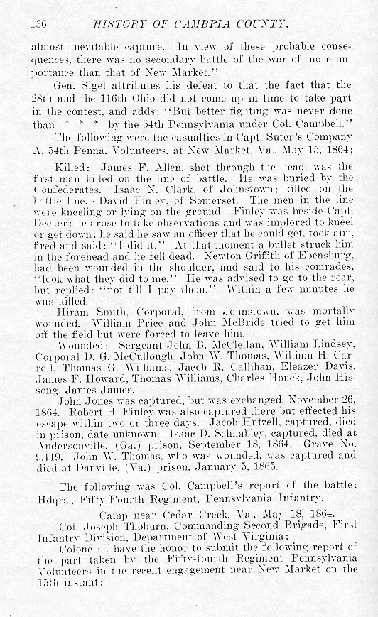 almost inevitable capture. In view of these probable consequences, there was no secondary battle of the war of more importance than that of New Market.” Gen. Sigel attributes his defeat to that the fact that the 28th and the 116th Ohio did not come up in time to take part in the contest, and adds: “But better fighting was never done than * * * by the 54th Pennsylvania under Col. Campbell.” The following were the casualties in Capt. Suter's Company A. 54th Penna. Volunteers, at New Market, Va., May 15, 1864; Killed: James F. Allen, shot through the head, was the first man killed on the line of battle. He was buried by the Confederates. Isaac N. Clark, of Johnstown; killed on the battle line. David Finley, of Somerset. The men in the line were kneeling or lying on the ground. Finley was beside Capt. Decker; he arose to take observations and was implored to kneel or get down; he said he saw an officer that he could get, took aim, fired and said; “I did it.” At that moment a bullet struck him in the forehead and he fell dead. Newton Griffith of Ebensburg, had been wounded in the shoulder, and said to his comrades, “look what they did to me.” He was advised to go to the rear, but replied; “not till I pay them.” Within a few minutes he was killed. Hiram Smith, Corporal, from Johnstown, was mortally wounded. William Price and John McBride tried to get him off the field but were forced to leave him. Wounded: Sergeant John B. McClellan, William Lindsey, Corporal D. G. McCullough, John W. Thomas, William H. Carroll, Thomas G. Williams, Jacob R. Callihan, Eleazer Davis, James F. Howard, Thomas Williams, Charles Houck, John Hissong, James James. John Jones was captured, but was exchanged, November 26, 1864. Robert H. Finley was also captured there but effected his escape within two or three days. Jacob Hutzell, captured, died in prison, date unknown. Isaac D. Schnabley, captured, died at Andersonville, (Ga.) prison, September 18, 1864. Grave No. 9,119. John W. Thomas, who was wounded, was captured and died at Danville, (Va.) prison, January 5, 1865. The following was Col. Campbell's report of the battle: Hdqrs., Fifty-Fourth Regiment, Pennsylvania Infantry. Camp near Cedar Creek, Va., May 18, 1864.
