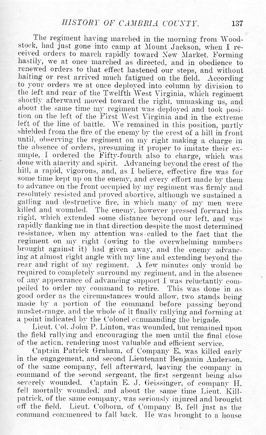 The regiment having marched in the morning from Woodstock, had just gone into camp at Mount Jackson, when I received orders to march rapidly toward New Market. Forming hastily, we at once marched as directed, and in obedience to renewed orders to that effect hastened our steps, and without halting or rest arrived much fatigued on the field. According to your orders we at once deployed into column by division to the left and rear of the Twelfth West Virginia, which regiment shortly afterward moved toward the right, unmasking us, and about the same time my regiment was deployed and took position on the left of the First West Virginia and in the extreme left of the line of battle. We remained in this position, partly shielded from the fire of the enemy by the crest of a hill in front until, observing the regiment on my right making a charge in the absence of orders, presuming it proper to imitate their example, I ordered the Fifty-fourth also to charge, which was done with alacrity and spirit. Advancing beyond the crest of the hill, a rapid, vigorous, and, as I believe, effective fire was for some time kept up on the enemy, and every effort made by them to advance on the front occupied by my regiment was firmly and resolutely resisted and proved abortive, although we sustained a galling and destructive fire, in which many of my men were killed and wounded. The enemy, however pressed forward his right, which extended some distance beyond our left, and was rapidly flanking me in that direction despite the most determined resistance, when my attention was called to the fact that the regiment on my right (owing to the overwhelming numbers brought against it) had given away, and the enemy advancing at almost right angle with my line and extending beyond the rear and right of my regiment. A few minutes only would be required to completely surround my regiment, and in the absence of any appearance of advancing support I was reluctantly compelled to order my command to retire. This was done in as good order as the circumstances would allow, two stands being made by a portion of the command before passing beyond musket-range, and the whole of it finally rallying and forming at a point indicated by the Colonel commanding the brigade. Lieut. Col. John P. Linton, was wounded, but remained upon the field rallying and encouraging the men until the final close of the action, rendering most valuable and efficient service. Captain Patrick Graham, of Company E, was killed early in the engagement, and second Lieutenant Benjamin Anderson, of the same company, fell afterward, leaving the company in command of the second sergeant, the first sergeant being also severely wounded. Captain E. J. Geissinger, of company H, fell mortally wounded; and about the same time Lieut. Killpatrick, of the same company, was seriously injured and brought off the field. Lieut. Colborn, of Company B, fell just as the command commenced to fall back. He was brought to a house |