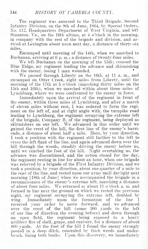 The regiment was annexed to the Third Brigade, Second Infantry Division, on the 9th of June, 1864, by Special Orders, No. 112, Headquarters Department of West Virginia, and left Staunton, Va., on the 10th ultimo, at 4 o'clock in the morning, in company with the rest of the brigade and division, and arrived at Lexington about noon next day, a distance of thirty-six miles. Encamped until morning of the 14th, when we marched to Buchanan, arriving at 6 p. m.; a distance of twenty-four miles. We left Buchanan on the morning of the 15th; crossed the Blue Ridge, my regiment leading the advance and skirmishing with the enemy, losing 1 man wounded. We passed through Liberty on the 16th, at 11 a. m., and encamped on Otter Creek, eight miles from Liberty, until the morning of the 17th at 5 o'clock (marching thirty miles on the 15th and 16th), when we marched within about three miles of Lynchburg, where we were confronted by the enemy in force. Immediately upon the arrival of the regiment in front of the enemy, within three miles of Lynchburg, and after a march of eleven miles without rest, I was ordered to form the regiment on the left of, and at right angle with, the turnpike road leading to Lynchburg, the regiment occupying the extreme left of the brigade, Company B, of the regiment, being deployed as skirmishers on our left. We advanced in this order until we gained the crest of the hill, the first line of the enemy's barricade, a distance of about half a mile. Here, by your direction, I took a position with the regiment still farther to the left to cross the left flank of the line, and again advanced down over the hill through the woods, steadily driving the enemy before us, until we reached the foot of the hill. Night overtaking us, the advance was discontinued, and the action closed for the day, the regiment resting in line for about an hour, when our brigade was relieved by a brigade of the First Infantry Division, and we took a position, by your direction, about one-quarter of a mile to the rear of the line, and rested upon our arms until daylight next morning [18th of June] when we accompanied the brigade in a reconnaissance of the enemy's extreme left, marching a distance of about four miles. We returned at about 11 o'clock a. m. and formed in line near the ground on which we rested the previous night, my regiment occupying the extreme left, doubled by wing. Immediately upon the formation of the line I received your order to move forward, and we advanced over the crest of the hill (some 300 yards to the left of our line of direction the evening before) and down through an open field, the regiment being exposed to a heavy artillery fire of shell, grape, and canister, for a distance of about 800 yards. At the foot of the hill I found the enemy strongly posted in a deep ditch, concealed by thick weeds and underbrush, lining both banks. Upon this discovery, we immediately |