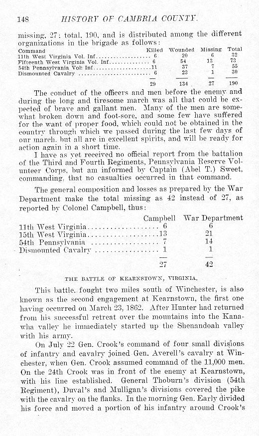 This battle, fought two miles south of Winchester, is also known as the second engagement at Kearnstown, the first one having occurred on March 23, 1862. After Hunter had returned from his successful retreat over the mountains into the Kanawha valley he immediately started up the Shenandoah valley with his army. On July 22 Gen. Crook's command of four small divisions of infantry and cavalry joined Gen. Averell's cavalry at Winchester, when Gen. Crook assumed command of the 11,000 men. On the 24th Crook was in front of the enemy at Kearnstown, with his line established. General Thoburn's division (54th Regiment), Duval's and Mulligan's divisions covered the pike with the cavalry on the flanks. In the morning Gen. Early divided his force and moved a portion of his infantry around Crook's |
