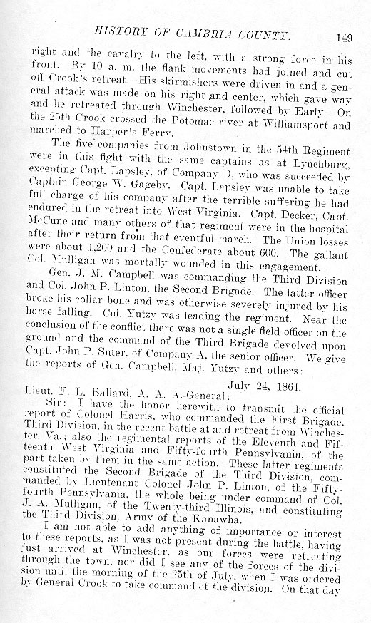 right and the cavalry to the left, with a strong force in his front. By 10 a. m. the flank movements had joined and cut off Crook's retreat. His skirmishers were driven in and a general attack was made on his right and center, which gave way and he retreated through Winchester, followed by Early. On the 25th Crook crossed the Potomac river at Williamsport and marched to Harper's Ferry. The five companies from Johnstown in the 54th Regiment were in this fight with the same captains as at Lynchburg, excepting Capt. Lapsley, of Company D, who was succeeded by Captain George W. Gageby. Capt. Lapsley was unable to take full charge of his company after the terrible suffering he had endured in the retreat into West Virginia. Capt. Decker, Capt. McCune and many others of that regiment were in the hospital after their return from that eventful march. The Union losses were about 1,200 and the Confederate about 600. The gallant Col. Mulligan was mortally wounded in this engagement. Gen. J. M. Campbell was commanding the Third division and Col. John P. Linton, the Second Brigade. The latter officer broke his collar bone and was otherwise severely injured by his horse falling. Col. Yutzy was leading the regiment. Near the conclusion of the conflict there was not a single field officer on the ground and the command of the Third Brigade devolved upon Capt. John P. Suter, of Company A, the senior officer. We give the reports of Gen. Campbell, Maj. Yutzy and others: July 24, 1864.