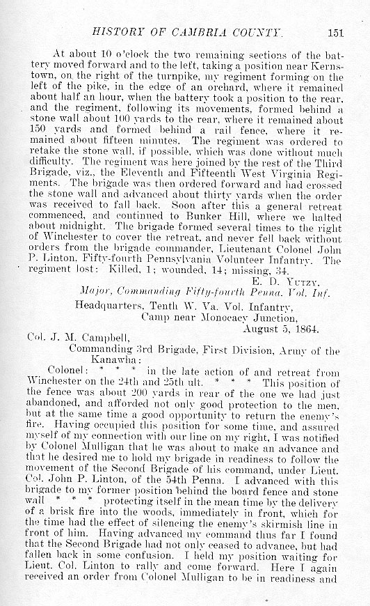 At about 10 o'clock the two remaining sections of the battery moved forward and to the left, taking a position near Kernstown, on the right of the turnpike, my regiment forming on the left of the pike, in the edge of an orchard, where it remained about half an hour, when the battery took a position to the rear, and the regiment, following its movements, formed behind a stone wall about 100 yards to the rear, where it remained about 150 yards and formed behind a rail fence, where it remained about fifteen minutes. The regiment was ordered to retake the stone wall, if possible, which was done without much difficulty. The regiment was here joined by the rest of the Third Brigade, viz., the Eleventh and Fifteenth West Virginia Regiments. The brigade was then ordered forward and had crossed the stone wall and advanced about thirty yards when the order was received to fall back. Soon after this a general retreat commenced, and continued to Bunker Hill, where we halted about midnight. The brigade formed several times to the right of Winchester to cover the retreat, and never fell back without orders from the brigade commander, Lieutenant Colonel John P. Linton. Fifty-fourth Pennsylvania Volunteer Infantry. The regiment lost: Killed, 1; wounded, 14; missing, 34. E. D. Yutzy. Major, Commanding Fifty-fourth Penna. Vol. Inf. Headquarters, Tenth W. Va. Vol. Infantry, Camp near Monocacy Junction, August 5, 1864. Col. J. M. Campbell, Commanding 3rd Brigade, First Division, Army of the Kanawha: Colonel: * * * in the late action of and retreat from Winchester on the 24th and 25th ult. * * * This position of the fence was about 200 yards in rear of the one we had just abandoned, and afforded not only good protection to the men, but at the same time a good opportunity to return the enemy's fire. Having occupied this position for some time, and assured myself of my connection with our line on my right, I was notified by Colonel Mulligan that he was about to make an advance and that he desired me to hold my brigade in readiness to follow the movement of the Second Brigade of his command, under Lieut. Col. John P. Linton, of the 54th Penna. I advanced with this brigade to my former position behind the board fence and stone wall * * * protecting itself in the mean time by the delivery of a brisk fire into the woods, immediately in front, which for the time had the effect of silencing the enemy's skirmish line in front of him. Having advanced my command thus far I found that the Second Brigade had not only ceased to advance, but had fallen back in some confusion. I held my position waiting for Lieut. Col. Linton to rally and come forward. Here I again received an order from Colonel Mulligan to be in readiness and |