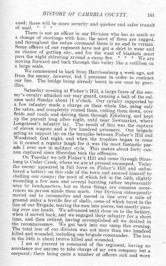 ened; there will be more security and quicker and safer transit of mail. * * * There is not an officer in our Division who has as much as a change of stockings with him; the most of them are ragged, and throughout the entire command there is no end to vermin. Some officers of our regiment have not got a shirt to wear and no chance of getting any, and for the want of blankets must pass the night shivering around a camp fire. * * * We are moving forward and back through this valley like a cotillion on a large scale. We commenced to back from Harrisonburg a week ago, not from the enemy, however, but I presume in order to contract our line. The bridge being already burnt in our rear by guerillas. Saturday evening at Fisher's Hill, a large force of the enemy's cavalry attacked our rear guard, causing a halt of the column until Sunday about 11 o'clock. Our cavalry supported by a few infantry made a charge on their whole line, using only the sabre, and completely routed them, cutting them down, over fields and roads and driving them through Edinburg, and kept up the pursuit long after night, until near Newmarket, where Longstreet's infantry lay. The result of this was the capture of eleven wagons and a few hundred prisoners. Our brigade acting as support lay on the turnpike between Fisher's Hill and Woodstock that night, and when the trophies began to come in it caused a regular laugh for it was the most fantastic parade I ever saw in military style. This makes about forty cannon captured since Sheridan took the offensive. On Tuesday we left Fisher's Hill and came through Strasburg to Cedar Creek, where we are at present encamped. Today the enemy appeared in full force on Fisher's Hill and unlimbered a battery on this side of the town and amused himself by shelling our camps; the most of which fell in the 54th slightly wounding a few men and several bursting rather unpleasantly near by headquarters, but as these things are common occurrences no person minds them much. Our Division subsequently moved out to reconnoiter and moved in line over a mile of ground under a terrific fire of shells, some of which burst in the line of our Brigade, tearing the men into pieces, but mostly passing over our heads. We advanced until close on to the battery, when it moved back, and we engaged their infantry for a short time, and then retired, having accomplished all we desired in the reconnaissance. We got back into our camp this evening. The total loss of our division was not more than two hundred killed and wounded, including one brigade commander. The loss in the 54th is about twelve killed and wounded. I am at present in command of the regiment, having no assistance nor anyone to take charge of my own company but a corporal; there being quite a number of officers sick and worn |