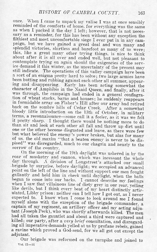 once. When I came to unpack my valise I was at once sensibly reminded of the comforts of home, for everything was the same way when I packed it the day I left; however, that is not necessary as a reminder, for this has been without any exception the filthiest and most uncomfortable siege I ever put in in any campaign, but we have gained a great deal and won many and splendid victories, shirtless and barefoot as many of us were; this, like a great many other trying things, is nice to think about after it is all over and ended well, but not pleasant to contemplate trying on again should the exigencies of the service demand it this winter, as the uncertainty of the present may still indicate. The operations of this valley campaign have been a sort of an enigma pretty hard to solve; two large armies have been butting and rubbing against each other all summer, appearing and disappearing. Early has been acting somewhat the character of Amphibis in the Naaid Queen, and finally, after it was through, the campaign had ended in a general conflagration of wheat stacks, barns and houses; he suddenly reappears in formidable array on Fisher's Hill after our army had retired back on the somber hills of Cedar Creek. After a somewhat bloody little introduction on the 13th of October, in military terms, a reconnaissance – some call it a feeler, as it was we felt it pretty sharp. I thought there would be nothing more to do than sit and look at each other all fall and throw up dirt until one or the other become disgusted and leave, as there were few but what believed the enemy's power broken, but alas for many of us, the old maxim “that a beaten enemy is never to be dispised” was disregarded, much to our chagrin and nearly to the sorrow of the country. On the morning of the 19th daylight was ushered in by the roar of musketry and cannon, which was incessant the whole day through. A division of Longstreet's attacked our small brigade by surprise, before daylight; we occupied an advanced point on the left of the line and without support our men fought gallantly and held him in check until daylight, when the balls began to come into our backs. I cannot describe my feelings when I saw that villainous line of dirty grey in our rear, yelling like devils, but I think every beat of my heart distinctly articulated, Libby prison: neither can I tell how I got out, as I never expected to. I know when I came to look around me I found myself alone with the exception of the brigade commander, a captain of my regiment, an artillery officer and my acting adjutant (Joseph Peck), who was shortly afterwards killed. The men had all taken the gauntlet and about a third were captured and killed; our party, after a very brief consultation, and disregarding all imperative demands yelled at us by profane rebels, gained a ravine which proved a God-send, for we all got out except the adjutant. Our brigade was reformed on the turnpike and joined to |