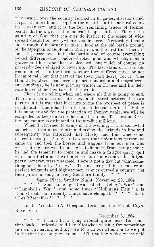 they swarm over the country formed in brigades, divisions and corps. It is without exception the most beautiful natural country I ever saw, and it is the few remaining traces of former beauty that now give it the mournful aspect it has. There is no painting of War that can ever do justice to the scene of wide spread desolation everywhere visible here. Yesterday I rode out through Winchester to take a look at the old battle ground of the Opequan of September 19th; it was the first time I saw it since I passed over it in the battle and of course everything looked different--no wonder--broken guns and wheels, sunken graves and here and there a bleached bone which of course, no passer-by feels obliged to cover up. The last stand of the rebels was made close to the town, whether they suffered much or not I cannot tell, but that part of the town paid dearly for it. The Hon. J. G. Mason had here a princely mansion and magnificent surroundings; he is now playing traitor in France and his delicate hearthstone lies bare to the winds. There is no telling when and where all this is going to end. There is such a sea of bitterness and hatred between the two parties in this war that it occurs to me the prospect of peace is yet distant. There has been too much destruction in the Valley this summer and for the protection of Pennsylvania, we will be compelled to keep an army here all the time. The loss in Rockingham county is estimated at twenty-five millions. When I returned to camp in the evening, I was somewhat surprised at an unusual stir and seeing the brigade in line and subsequently was informed that Mosby had this time come nearer to camp. A day or two ago that ubiquitous personage came up and took the horses and wagons from our men who were cutting fire wood not a great distance from camp; today he had the temerity to come in and make a fatigue party quit work on a fort almost within rifle shot of our camp; the fatigue party however, were unarmed; there is not a day but what something is "done by Mosby." The majority of his men are as perfect brigands and highwaymen as ever cursed a country, yet their praise is sung in every Southern family. * * * Same place, Sunday Night, November 29, 1864.