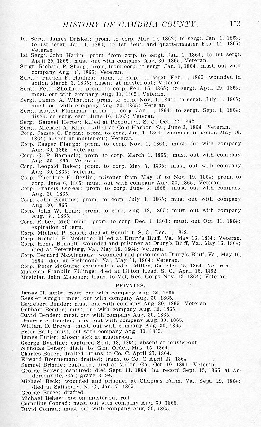 - Sergt. August Flanagan; prom. to corp. Jan. 1, 1864; to sergt. Sept. 1, 1864; disch. on surg. cert. June 16, 1865; Veteran.