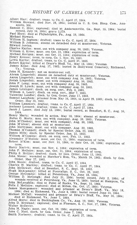 - Michael McCall; wounded and prisoner at Drury's Bluff, Va., May 16, 1864; died at Richmond, Va., June 7, 1864.