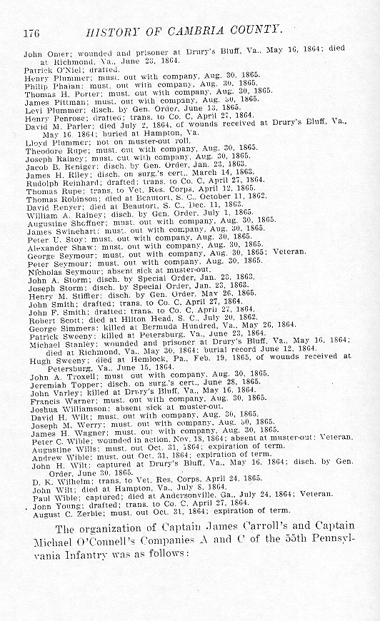 The organization of Captain James Carroll's and Captain Michael O'Connell's Companies A and C of the 55th Pennsylvania Infantry was as follows: