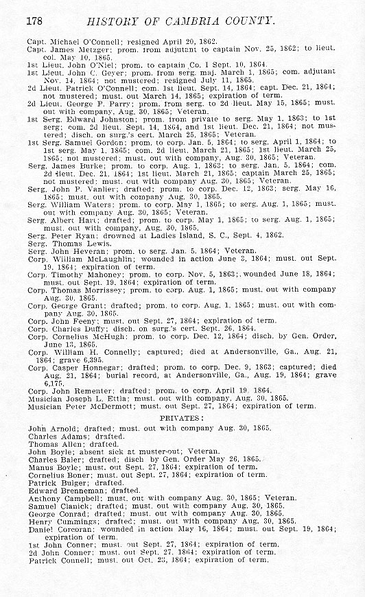 - Corp. William H. Connelly; captured; died at Andersonville, Ga., Aug. 21, 1864; grave 6,395.