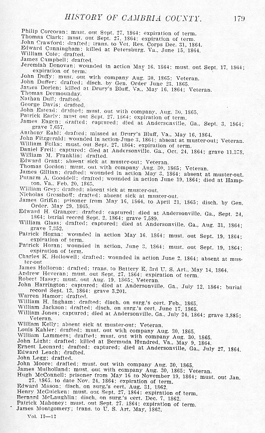 - James Eagen; drafted; captured; died at Andersonville, Ga., Sept. 3, 1864; grave 7,657
