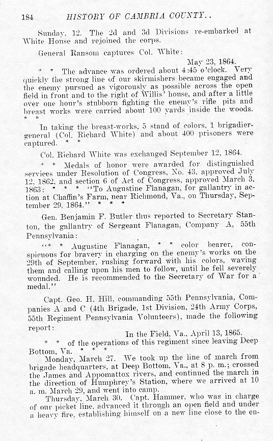 * * The advance was ordered about 4:45 o'clock. Very quickly the strong line of our skirmishers became engaged and the enemy pursued as vigorously as possible across the open field in front and to the right of Willis' house, and after a little over one hour's stubborn fighting the enemy's rifle pits and breast works were carried about 100 yards inside the woods. * * In taking the breast-works, 5 stands of colors, 1 brigadier-general (Col. Richard White) and about 400 prisoners were captured. * * Col. Richard White was exchanged September 12, 1864. * * Medals of honor were awarded for distinguished services under Resolution of Congress, No. 43, approved July 12, 1862, and Section 6 of Act of Congress, approved March 3, 1863: * * * To Augustine Flanagan, for gallantry in action at Chaffin's Farm, near Richmond, Va., on Thursday, September 29, 1864. * * * Gen. Benjamin F. Butler thus reported to Secretary Stanton, the gallantry of Sargeant Flanagan, Company A, 55th Pennsylvania: * * Augustine Flanagan, * * color bearer, conspicuous for bravery in charging on the enemy's works on the 29th of September, rushing forward with his colors, waving them and calling upon his men to follow, until he fell severely wounded. He is recommended to the Secretary of War for a medal. Capt. Geo. H. Hill, commanding 55th Pennsylvania, Companies A and C (4th Brigade, 1st Division, 24th Army Corps, 55th Regiment Pennsylvania Volunteers), made the following report: In the Field, Va., April 13, 1865.
