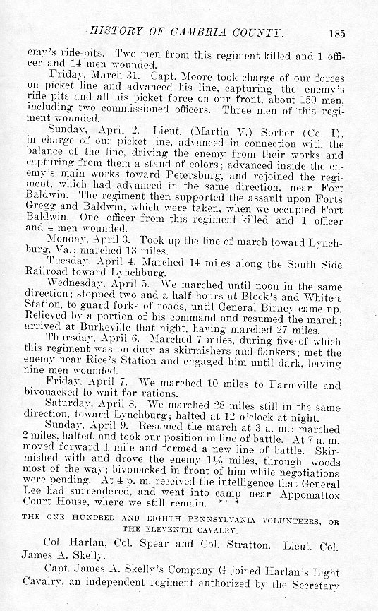 emy's rifle-pits. Two men from this regiment killed and 1 officer and 14 men wounded. Friday, March 31. Capt. Moore took charge of our forces on picket line and advanced his line, capturing the enemy's rifle pits and all his picket force on our front, about 150 men, including two commissioned officers. Three men of this regiment wounded. Sunday, April 2. Lieut. (Martin V.) Sorber (Co. 1), in charge of our picket line, advanced in connection with the balance of the line, driving the enemy from their works and capturing from them a stand of colors; advanced inside the enemy's main works toward Petersburg, and rejoined the regiment, which had advanced in the same direction, near Fort Baldwin. The regiment then supported the assault upon Forts Gregg and Baldwin, which were taken, when we occupied Fort Baldwin. One officer from this regiment killed and 1 officer and 4 men wounded. Monday, April 3. Took up the line of march toward Lynchburg, Va.; marched 13 miles. Tuesday, April 4. Marched 14 miles along the South Side Railroad toward Lynchburg. Wednesday, April 5. We marched until noon in the same direction; stopped two and a half hours at Block's and White's Station, to guard forks of roads, until General Birney came up. Relieved by a portion of his command and resumed the march; arrived at Burkeville that night, having marched 27 miles. Thursday, April 6. Marched 7 miles, during five of which this regiment was on duty as skirmishers and flankers; met the enemy near Rice's Station and engaged him until dark, having nine men wounded. Friday, April 7. We marched 10 miles to Farmville and bivouacked to wait for rations. Saturday, April 8. We marched 28 miles, still in the same direction, toward Lynchburg; halted at 12 o'clock at night. Sunday, April 9. Resumed the march at 3 a.m.; marched 2 miles; halted, and took our position in line of battle. At 7 a.m. moved forward 1 mile and formed a new line of battle. Skirmished with and drove the enemy 1 1/2 miles, through woods most of the way; bivouacked in front of him while negotiations were pending. At 4 p.m. received the intelligence that General Lee had surrendered, and went into camp near Appomattox Court House, where we still remain. * * THE ONE HUNDRED AND EIGHTH PENNSYLVANIA VOLUNTEERS, OR