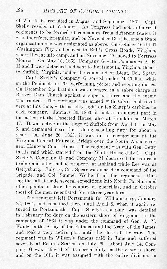 of War to be recruited in August and September, 1861. Capt. Skelly resided at Wilmore. As Congress had not authorized regiments to be formed of companies from different States, it was, therefore, irregular, and on November 13, it became a State organization and was designated as above. On October 16 it left Washington City and moved to Ball's Cross Roads, Virginia, where it went into camp, and on November 17 moved to Fortress Monroe. On May 15, 1862, Company G with Companies A, E, H and I were detached and sent to Portsmouth, Virginia, thence to Suffolk, Virginia, under the command of Lieut. Col. Spear. Capt. Skelly's Company G served under McClellan while on the Peninsula in '62, performing picket and scouting duties. On December 2 a battalion was engaged in a sabre charge at Beaver Dam Church against a superior force and the enemy was routed. The regiment was armed with sabres and revolvers at this time, with possibly eight or ten Sharp's carbines to each company. January 30, 1863, it took a prominent part in the action at the Deserted House, also at Franklin on March 17. It was active in the siege of Suffolk from April 11 to May 3, and remained near there doing scouting duty for about a year. On June 26, 1863, it was in an engagement at the Virginia Central Railroad Bridge over the South Anna river, near Hanover Court House. The regiment was with Gen. Getty in his raid which started from the White House July 1. Capt. Skelly's Company G, and Company M destroyed the railroad bridge and other public property at Ashland while Lee was at Gettysburg. July 16, Col. Spear was placed in command of the brigade, and Col. Samuel Wetherill of the regiment. During the fall it made several expeditions into North Carolina and other points to clear the country of guerrillas, and in October most of the men re-enlisted for a three year term. The regiment left Portsmouth for Williamsburg, January 23, 1864, and remained there until April 8, when it again returned to Portsmouth. Capt. Skelly's company was detailed in February for duty on the eastern shore of Virginia. In the campaign of 1864 it was under the command of Gen. A. V. Kantz, in the Army of the Potomac and the Army of the James, and took a very active part until the close of the war. The regiment was in Wilson's famous raid in June and suffered severely at Ream's Station on July 29. About July 14, Company G was relieved of its special duty on the eastern shore, and on the 16th it was assigned with the entire division to |