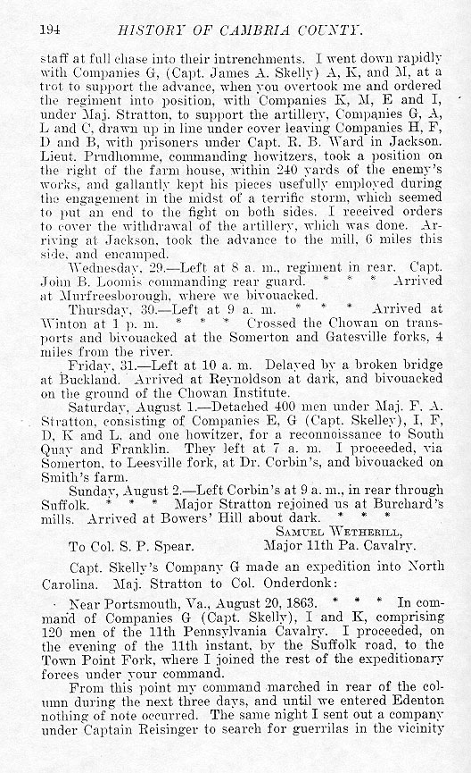 staff at full chase into their entrenchments. I went down rapidly with Companies G, (Capt. James A. Skelly) A, K, and M, at a trot to support the advance, when you overtook me and ordered the regiment into position, with Companies K, M, E and I, under Maj. Stratton, to support the artillery, Companies G, A, L and C, drawn up in line under cover leaving Companies H. F, D and B, with prisoners under Capt. R. B. Ward in Jackson. Lieut. Prudhomme, commanding howitzers, took a position on the right of the farm house, within 240 yards of the enemy's works, and gallantly kept his pieces usefully employed during this engagement in the midst of a terrific storm, which seemed to put an end to the fight on both sides. I received orders to cover the withdrawal of the artillery, which was done. Arriving at Jackson, took the advance to the mill, 6 miles to this side, and encamped. Wednesday, 29.-- Left at 8 a.m., regiment in rear. Capt. John B. Loomis commanding rear guard. * * * Arrived at Murfreesborough, where we bivouacked. Thursday, 30.-- Left at 9 a.m. * * * Arrived at Winton at 1 p.m. * * * Crossed the Chowan on transports and bivouacked at the Somerton and Gatesville forks, 4 miles from the river. Friday, 31. --Left at 10 a.m. Delayed by a broken bridge at Buckland. Arrived at Reynoldson at dark, and bivouacked on the ground of the Chowan Institute. Saturday, August 1.-- Detached 400 men under Maj. F. A. Stratton, consisting of Companies E, G (Capt. Skeller), I, F, D, K and L, and one howitzer, for a reconnoissance to South Quay and Franklin. They left at 7 a.m. I proceeded, via Somerton, to Leesville fork, at Dr. Corbin's and bivouacked on Smith's farm. Sunday, August 2.--Left Corbin's at 9 a.m., in rear through Suffolk. * * * Major Stratton rejoined us at Burchard's mills. Arrived at Bowers' Hill about dark. * * * SAMUEL WETHERILL
