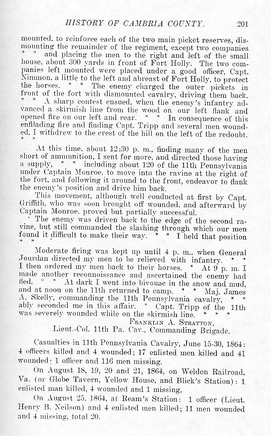 mounted, to reinforce each of the two main picket reserves, dismounting the remainder of the regiment, except two companies * * and placing the men to the right and left of the small house, about 300 yards in front of Fort Holly. The two companies left mounted were placed under a good officer, Capt. Nimmon, a little to the left and abreast of Fort Holly, to protect the horses. * * The enemy charged the outer pickets in front of the fort with dismounted cavalry, driving them back. * * A sharp contest ensued, when the enemy's infantry advanced a skirmish line from the wood on our left flank and opened fire on our left and rear. * * In consequence of this enfilading fire and finding Capt. Tripp and several men wounded, I withdrew to the crest of the hill on the left of the redoubt. * * At this time, about 12:30 p. m., finding many of the men short of ammunition, I sent for more, and directed those having a supply, * * including about 120 of the 11th Pennsylvania under Captain Monroe, to move into the ravine at the right of the fort and following it around to the front, endeavor to flank enemy's position and drive him back. This movement, although well conducted at first by Capt. Griffith, who was soon brought off wounded, and afterward by Captain Monroe, proved but partially successful. The enemy was driven back to the edge of the second ravine, but still commanded the slashing through which our men found it difficult to make their way. * * I held that position * * Moderate firing was kept up until 4 p.m., when General Jourdan directed my men to be relieved with infantry. * * I then ordered my men back to their horses. * At 9 p. m. I Made another reconnoissance and ascertained the enemy had fled. * * At dark I went into bivouac in the snow and mud, and at noon on the 11th returned to camp. * * Maj. James A. Skelly, commanding the 11th Pennsylvania cavalry, * * ably seconded me in this affair. * Capt. Tripp of the 11th |