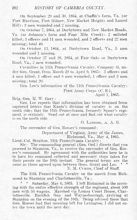 On September 29 and 30, 1864, at Chaffin's farm, Va. (or Fort Harrison, Fort Gilmer, New Market Heights and Laurel Hill) : 3 men wounded and 2 missing. On October 7, 1864, at Darbytown and New Market Roads, Va. (or Johnson's farm and Four Mile Creek): 2 enlisted killed; 3 officers and 11 men wounded, and 2 officers and 22 men Missing; total 40. On October 13, 1864, at Darbytown Road, Va., 5 men wounded and 1 missing. On October 27 and 28, 1864, at Fair Oaks or Darbytown Road, Va., 2 men wounded. Casualties in 11th Pennsylvania Cavalry, Company G, under Gen. Grant, from March 29 to April 9, 1865: 3 officers and 4 men killed; 1 officer and 8 men wounded; 1 officer and 3 men missing; total 20. Gen. Lee's information of the 11th Pennsylvania Cavalry: First Army Corps (C.S.),