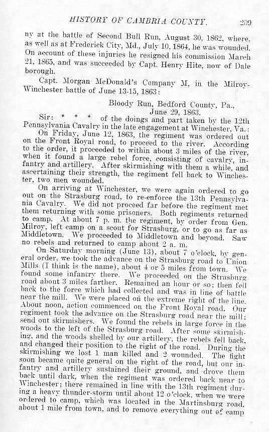ny at the battle of Second Bull Run, August 30, 1862, where, as well as at Frederick City, Md., July 10, 1864, he was wounded. On account of these injuries he resigned his commission March 21, 1865, and was succeeded by Capt. Henry Hite, now of Dale borough. Capt. Morgan McDonald's Company M, in the Milroy-Winchester battle of June 13-15, 1863: Bloody Run, Bedford County, Pa.,