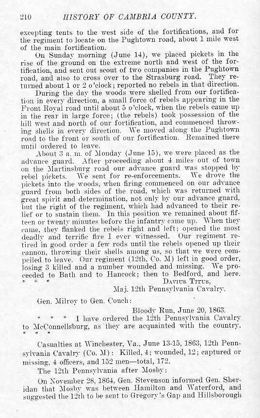 * * * I have ordered the 12th Pennsylvania Cavalry to McConnellsburg, as they are acquainted with the country. * * *Casualties at Winchester, Va., June 13-15, 1863, 12th Pennsylvania Cavalary (Co.M): Killed, 4; wounded, 12; captured or missing, 4 officers, and 152 men –total, 172. The 12th Pennsylvania after Mosby: On November 28 1864, Gen. Stevenson informed Gen. Sheridan that Mosby was between Hamilton and Waterford, and suggested the 12th to be sent to Gregory's Gap and Hillsborough |