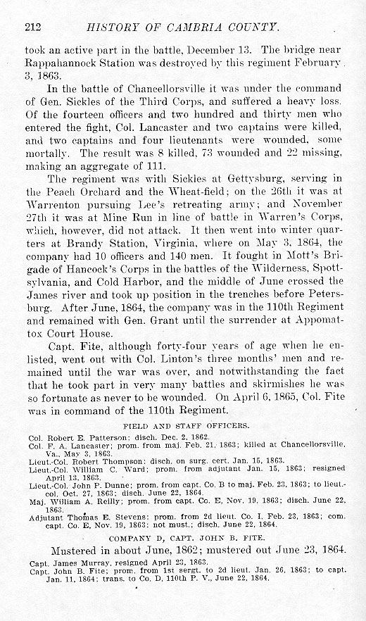 took an active part in the battle, December 13. The bridge near Rappahannock Station was destroyed by this regiment February 3, 1863. In the battle of Chancellorsville it was under the command of Gen. Sickles of the Third Corps, and suffered a heavy loss. Of the fourteen officers and two hundred and thirty men who entered the fight, Col. Lancaster and two captains were killed, and two captains and four lieutenants were wounded, some mortally. The result was 8 killed, 73 wounded and 22 missing, making an aggregate of 111. The regiment was with Sickles at Gettysburg, serving in the Peach Orchard and the Wheat-field; on the 26th it was at Warrenton pursuing Lee's retreating army; and November 27th it was at Mine Run in line of battle in Warren's Corps, which, however, did not attack. It then went into winter quarters at Brandy Station, Virginia, where on May 3, 1864, the company had 10 officers and 140 men. It fought in Mott's Brigade of Hancock's Corps in the battles of the Wilderness, Spottsylvania, and Cold Harbor, and the middle of June crossed the James river and took up position in the trenches before Petersburg. After June, 1864, the company was in the 110th Regiment and remained with Gen. Grant until the surrender at Appomattox Court House. Capt. Fite, although forty-four years of age when he enlisted, went out with Col. Linton's three months' men and remained until the war was over, and notwithstanding the fact that he took part in very many battles and skirmishes he was so fortunate as never to be wounded. On April 6, 1865, Col. Fite was in command of the 110th Regiment. FIELD AND STAFF OFFICERS.