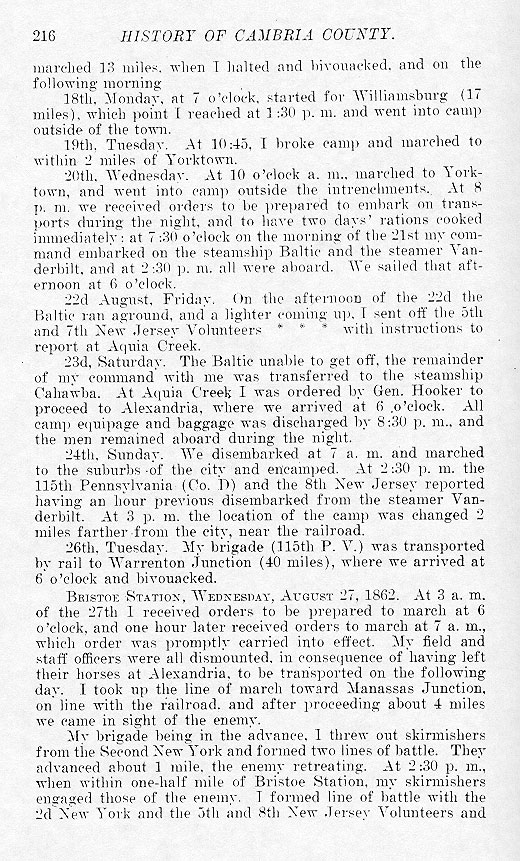 marched 13 miles, when I halted and bivouacked, and on the following morning 18th, Monday, at 7 o'clock, started for Williamsburg (17 miles), which point I reached at 1:30 p.m. and went into camp outside of the town. 19th, Tuesday. At 10:45, I broke camp and marched to within 2 miles of Yorktown. 20th, Wednesday. At 10 o'clock a.m., marched to Yorktown, and went into camp outside the intrenchments. At 8 p.m. we received orders to be prepared to embark on transports during the night, and to have two days' rations cooked immediately: at 7:30 o'clock on the morning of the 21st my command embarked on the steamship Baltic and the steamer Vanderbilt and at 2:30 p.m. all were aboard. We sailed that afternoon at 6 o'clock. 22d August, Friday. On the afternoon of the 22d the Baltic ran aground and a lighter coming up, I sent off the 5th and 7th New Jersey volunteers * * * with instructions to report at Aquia Creek. 23d, Saturday. The Baltic unable to get off, the remainder of my command with me was transferred to the steamship Cahawba. At Aquia Creek, I was ordered by Gen. Hooker to proceed to Alexandria, where we arrived at 6 o'clock. All camp equipage and baggage was discharged by 8:30 p.m., and the men remained aboard during the night. 24th Sunday. We disembarked at 7 a.m. and marched to the suburbs of the city and encamped. At 2:30 p.m. the 115th Pennsylvania (Co. D) and the 8th New Jersey reported having an hour previous disembarked from the steamer Vanderbilt. At 3 p.m. the location of the camp was changed 2 miles farther from the city, near the railroad. 26th, Tuesday. My brigade (115th P.V.) was transported by rail to Warrenton Junction (40 miles), where we arrived at 6 o'clock and bivouacked. BRISTOE STATION, Wednesday, August 27, 1862. At 3 a.m. of the 27th I received orders to be prepared to march at 6 o'clock, and one hour alter received orders to march at 7 a.m. which order was promptly carried into effect. My field and staff officers were all dismounted, in consequence of having left their horses at Alexandria, to be transported on the following day. I took up the line of march toward Manassas Junction on line with the railroad, and after proceeding about 4 miles we came in sight of the enemy. My brigade being in the advance, I threw out skirmishers from the Second New York and formed two lines of battle They advanced about 1 mile, the enemy retreating. At 2:30 p.m., when within one-half mile of Bristoe Station, my skirmishers engaged those of the enemy. I formed line of battle with the 2d New York and the 5th and 8th New Jersey Volunteers and |