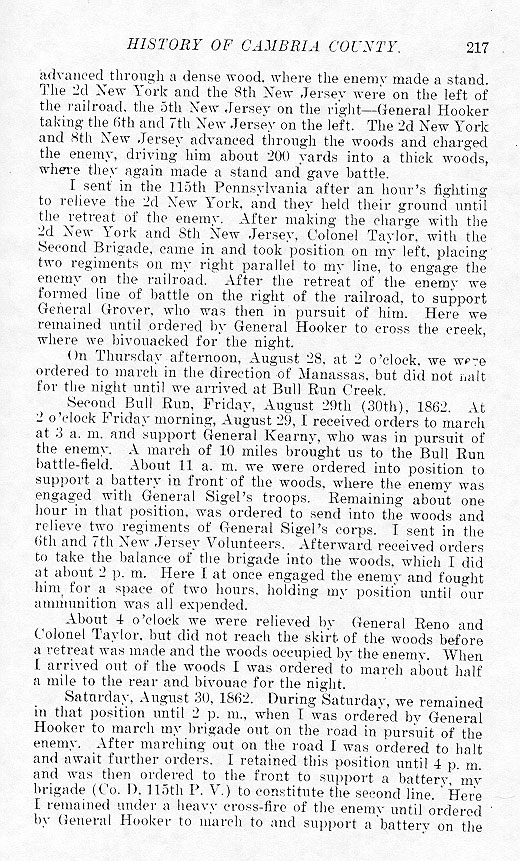 advanced through a dense wood, where the enemy made a stand. The 2d New York and the 8th New Jersey were on the left of the railroad, the 5th New Jersey on the right - General Hooker taking the 6th and 7th New Jersey on the left. The 2d New York and 8th New Jersey advanced through the woods and charged the enemy, driving him about 200 yards into a thick woods, where they again made a stand and gave battle. I sent in the 115th Pennsylvania after an hour's fighting to relieve the 2d New York, and they held their ground until the retreat of the enemy. After making the charge with the 2d New York and 8th New Jersey, Colonel Taylor, with the Second Brigade, came in and took position on my left, placing two regiments on my right parallel to my line, to engage the enemy on the railroad. After the retreat of the enemy we formed line of battle on the right of the railroad to support General Grover, who was then in pursuit of him. Here we remained until ordered by General Hooker to cross the creek, where we bivouacked for the night. On Thursday afternoon, August 28, at 2 o'clock, we were ordered to march in the direction of Manassas, but did not halt for the night until we arrived at Bull Run Creek. Second Bull Run, Friday, August 29th (30th), 1862. At 2 o'clock Friday morning, August 29, I received orders to march at 3 a.m. and support General Kearny, who was in pursuit of the enemy. A march of 10 miles brought us to the Bull Run battle-field. About 11 a.m. we were ordered into position to support a battery in front of the woods, where the enemy was engaged with General Sigel's troops. Remaining about one hour in that position, was ordered to send into the woods and relieve two regiments of General Sigel's corps. I sent in the 6th and 7th New Jersey Volunteers. Afterward received orders to take the balance of the brigade into the woods, which I did at about 2 p.m. Here I at once engaged the enemy and fought him for a space of two hours, holding my position until our ammunition was all expended. About 4 o'clock we were relieved by General Reno and Colonel Taylor, but did not reach the skirt of the woods before a retreat was made and the woods occupied by the enemy. When I arrived out of the woods I was ordered to march about half a mile to the rear and bivouac for the night. Saturday, August 30, 1862. During Saturday, we remained in that position until 2 p.m., when I was ordered by General Hooker to march my brigade out on the road in pursuit of the enemy. After marching out on the road I was ordered to halt and await further orders. I retained this position until 4 p.m. and was then ordered to the front to support a battery, my brigade (Co. D, 115th P.V.) to constitute the second line. Here I remained under a heavy cross-fire of the enemy until ordered by General Hooker to march to and support a battery on the |