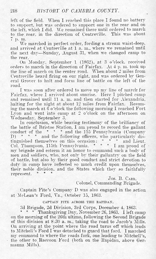 left of the field. When I reached this place I found no battery to support, but was ordered to support one in the rear and on the left, which I did. We remained there until ordered to march to the rear, in the direction of Centreville. This was about 7 p.m. We marched in perfect order, fording a stream waist-deep, and arrived at Centreville at 1 a.m., where we remained until the next day-Sunday, August 31, when we changed camp to the rear. On Monday, September 1 (1862), at 3 o'clock, received orders to march in the direction of Fairfax. At 4 p.m. took up the line of march on the center road. When about 2 miles from Centreville heard firing on our right, and was ordered by General Grover to halt and form line of battle on the left of the road. I was soon after ordered to move up my line of march for Fairfax, where I arrived about sunrise. Here I pitched camp and remained until 11 a.m. and then started for Alexandria, halting for the night at about 12 miles from Fairfax. Resuming the march at 6 o'clock the following morning I reached Fort Lyon and went into camp at 2 o'clock on the afternoon on Wednesday, September 3. In conclusion, while bearing testimony of the brilliancy of the battle of Bristoe Station, I am proud to record the gallant conduct of the * * * and the 115 Pennsylvania (Company D) * * * and the following officers, who particularly distinguished themselves on this occasion: * * * and Lieut. Col. Thompson, 115th Pennsylvania. * * * I am proud of my brigade and esteem it an honor to command such a body of men and soldiers, who, not only by their gallantry on the field of battle, but also by their good conduct and strict devotion to duty in camp have reflected so much credit upon themselves, their noble division, and the States which they so faithfully represent. * * * Jos. B. Carr
