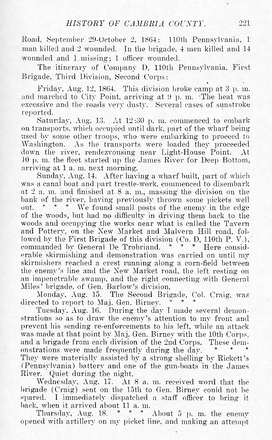 Road, September 29-October 2, 1864: 110th Pennsylvania, 1 man killed and 2 wounded. In the brigade, 4 men killed and 14 wounded and 1 missing; 1 officer wounded. The itinerary of Company D, 110th Pennsylvania, First Brigade, Third Division, Second Corps: Friday, August 12, 1864. This division broke camp at 3 p.m. and marched to City Point, arriving at 9 p.m. The heat was excessive and the roads very dusty. Several cases of sunstroke reported. Saturday, Aug. 13. At 12:30 p.m. commenced to embark on transports, which occupied until dark, part of the wharf being used by some other troops, who were embarking to proceed to Washington. As the transports were loaded they proceeded down the river, rendezvousing near Light-House Point. At 10 p.m. the fleet started up the James River for Deep Bottom, arriving at 1 a.m. next morning. Sunday, Aug. 14. After having a wharf built, part of which was a canal boat and part trestle-work, commenced to disembark at 2 a.m. and finished at 8 a.m., massing the division on the bank of the river, having previously thrown some pickets well out. * * * We found small posts of the enemy in the edge of the woods, but had no difficulty in driving them back to the woods and occupying the works near what is called the Tavern and Pottery on the New Market and Malvern Hill road, followed by the First Brigade of this division (Co. D, 110th P.V.), commanded by General De Trobriand. * * * Here considerable skirmishing and demonstration was carried on until my skirmishers reached a crest running along a corn-field between the enemy's line and the New Market road, the left resting on an impenetrable swamp, and the right connecting with General Miles' brigade, of Gen. Barlow's division. Monday, Aug. 15. The Second Brigade, Col. Craig, was directed to report to Maj. Gen. Birney. * * * Tuesday, Aug. 16. During the day I made several demonstrations so as to draw the enemy's attention to my front and prevent his sending re-enforcements to his left, while an attack was made at that point by Maj. Gen. Birney with the 10th Corps, and a brigade from each division of the 2nd Corps, and a brigade from each division of the 2nd Corps. These demonstrations were made frequently during the day. * * * They were materially assisted by a strong shelling by Rickett's (Pennsylvania) battery and one of the gun-boats in the James River. Quiet during the night. Wednesday, Aug. 17. At 8 a.m. received word that the brigade (Craig) sent on the 15th to Gen. Birney could not be spared. I immediately dispatched a staff officer to bring it back, when it arrived about 11 a.m. Thursday, Aug. 18. * * * About 5 p.m. the enemy opened with artillery on my picket line, and making an attempt |