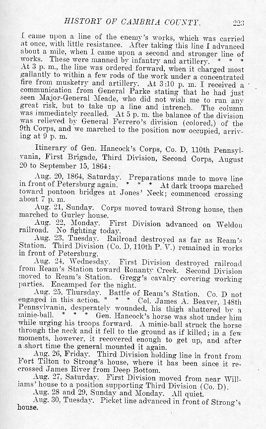 I came upon a line of the enemy's works, which was carried at once, with little resistance. After taking this line I advanced about a mile, when I came upon a second and stronger line of works. These were manned by infantry and artillery. * * * At 3 p.m., the line was ordered forward, when it charged most gallantly to within a few rods of the work under a concentrated fire from musketry and artillery. At 3:10 p.m. I received a communication from General Parke stating that he had just seen Major-General Meade, who did not wish me to run any great risk, but to take up a line and intrench. The column was immediately recalled. At 5 p.m. the balance of the division was relieved by General Ferrero's division (colored,) of the 9th Corps, and we marched to the position now occupied, arriving at 9 p.m. Itinerary of Gen. Hancock's Corps, Co. D, 110th Pennsylvania, First Brigade, Third Division, Second Corps, August 20 to September 15, 1864: Aug. 20, 1864, Saturday. Preparations made to move line in front of Petersburg again. * * * At dark troops marched toward pontoon bridges at Jones' Neck; commenced crossing about 7 p.m. Aug. 21, Sunday. Corps moved toward Strong house, then marched to Gurley house. Aug. 22, Monday. First Division advanced on Weldon railroad. No fighting today. Aug. 23, Tuesday. Railroad destroyed as far as Ream's Station. Third Division (Co. D, 110th P. V.) remained in works in front of Petersburg. Aug. 24, Wednesday. First Division destroyed railroad from Ream's Station toward Ronanty Creek. Second Division moved to Ream's Station. Gregg's cavalry covering working parties. Encamped for the night. Aug. 25, Thursday. Battle of Ream's Station. Co. D not engaged in this action. * * * Col. James A. Beaver, 148th Pennsylvania, desperately wounded, his thigh shattered by a minie-ball. * * * Gen. Hancock's horse was shot under him while urging his troops forward. A minie-ball struck the horse through the neck and it fell to the ground as if killed; in a few moments, however, it recovered enough to get up, and after a short time the general mounted it again. Aug. 26, Friday. Third Division holding line in front from Fort Tilton to Strong's house, where it has been since it recrossed James River from Deep Bottom. Aug. 27, Saturday. First Division moved from near Williams' house to a position supporting Third Division (Co. D). Aug. 28 and 29, Sunday and Monday. All quiet. Aug. 30, Tuesday. Picket line advanced in front of Strong's house. |