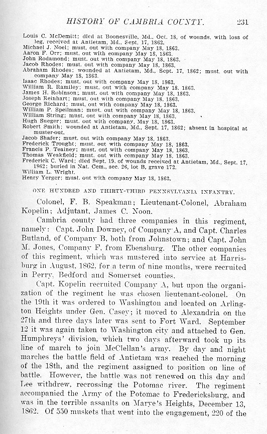 Colonel, F. B. Speakman; Lieutenant-Colonel, Abraham Kopelin; Adjutant, James C. Noon. Cambria county had three companies in this regiment, namely: Capt. John Downey, of Company A, and Capt. Charles Butland, of Company B, both from Johnstown; and Capt. John M. Jones, Company F, from Ebensburg. The other companies of this regiment, which was mustered into service at Harrisburg in August, 1862, for a term of nine months, were recruited in Perry, Bedford and Somerset counties. Capt. Kopelin recruited Company A, but upon the organization of the regiment he was chosen lieutenant-colonel. On the 19th it was ordered to Washington and located on Arlington Heights under Gen. Casey; it moved to Alexandria on the 27th and here days later was sent to Fort Ward. September 12 it was again taken to Washington city and attached to Gen. Humphreys' division, which two days afterward took up its line of march to join McClellan's army. By day and night marches the battle field of Antietam was reached the morning of the 18th, and the regiment assigned to position on line of battle. However, the battle was not renewed on this day and Lee withdrew, recrossing the Potomac river. The regiment accompanied the Army of the Potomac to Fredericksburg, and was in the terrible assaults on Marye's Heights, December 13, 1862. Of 550 muskets that went into the engagement, 220 of the |