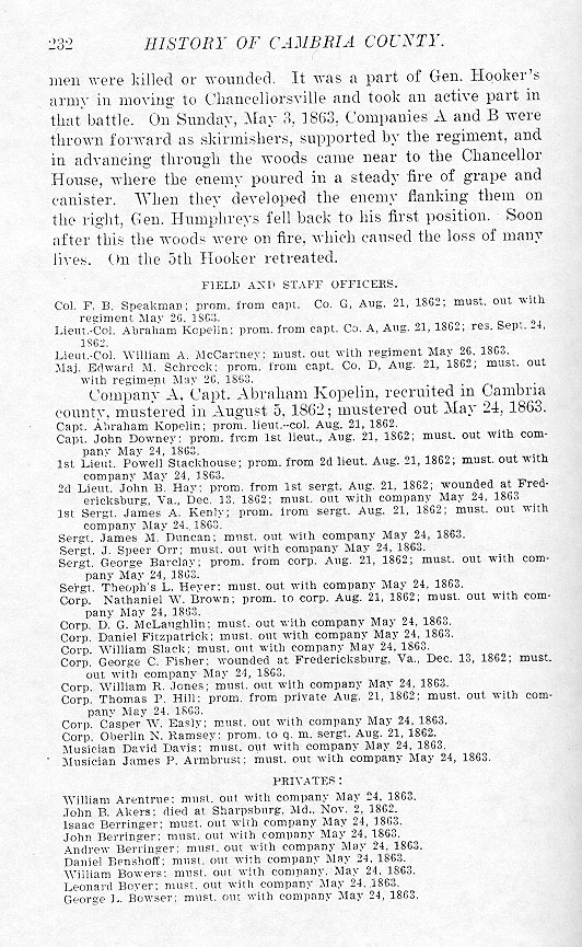 Company A, Capt. Abraham Kopelin, recruited in Cambria county, mustered in August 5, 1862; mustered out May 24, 1863.