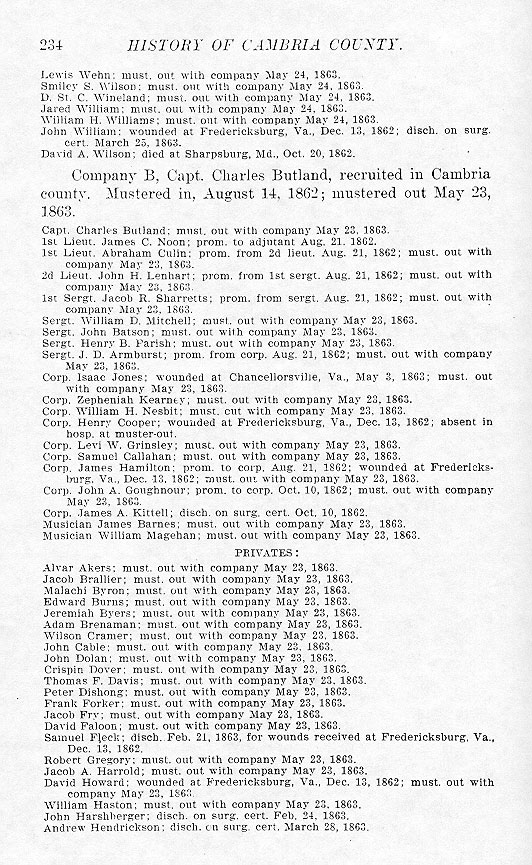 COMPANY B, Capt. Charles Butland, recruited in Cambria county. Mustered in, August 14, 1862; mustered out May 23, 1863.