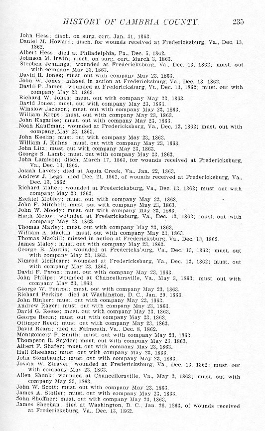 - Noah Kauffman; wounded at Fredericksburg, Va., Dec. 13, 1862; must. out with company, May 23, 1863.