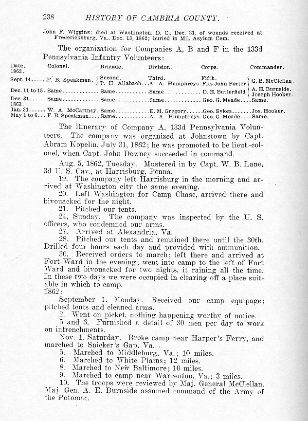 The itinerary of Company A, 133d Pennsylvania Volunteers. The company was organized at Johnstown by Capt. Abram Kopelin, July 31, 1862; he was promoted to be lieut.-colonel, when Capt. John Downey succeeded in command. Aug. 5, 1862, Tuesday. Mustered in by Capt. W. B. Lane, 3d U.S. Cav., at Harrisburg, Penna. 19. The company left Harrisburg in the morning and arrived at Washington city the same evening. 20. Left Washington for Camp Chase, arrived there and bivouacked for the night. 21. Pitched our tents. 24. Sunday. The company was inspected by the U.S. officers, who condemned our arms. 27. Arrived at Alexandria, Va. 28. Pitched our tents and remained there until the 30th. Drilled four hours each day and provided with ammunition. 30. Received orders to march; left there and arrived at Fort Ward in the evening; went into camp to the left of Fort Ward and bivouacked for two nights, it raining all the time. In these two days we were occupied in clearing off a place suitable in which to camp. 1862: September 1, Monday. Received our camp equipage; pitched tents and cleaned arms. 2. Went on picket, nothing happening worthy of notice. 5 and 6. Furnished a detail of 30 men per day to work on intrenchments. Nov. 1, Saturday. Broke camp near Harper's Ferry, and marched to Snicker's Gap, Va. 5. Marched to Middleburg, Va.; 10 miles. 6. Marched to White Plains; 12 miles 8. Marched to New Baltimore; 10 miles. 9. Marched to camp near Warrenton, Va.; 3 miles. 10. The troops were reviewed by Maj. General McClellan. Maj. Gen. A. E. Burnside assumed command of the Army of the Potomac. |