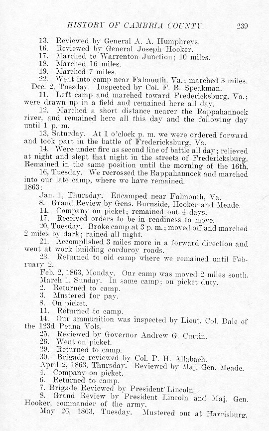 13. Reviewed by General A. A. Humphreys. 16. Reviewed by General Joseph Hooker. 17. Marched to Warrenton Junction; 10 miles. 18. Marched 16 miles. 19. Marched 7 miles. 22. Went into camp near Falmouth, Va.; marched 3 miles. Dec. 2, Tuesday. Inspected by Col. F. B. Speakman. 11. Left camp and marched toward Fredericksburg, Va.; were drawn up in a field and remained here all day. 12. Marched a short distance nearer the Rappahannock river, and remained here all this day and the following day until 1 p. m. 13. Saturday. At 1 o'clock p. m. we were ordered forward and took part in the battle of Fredericksburg, Va. 14. Were under fire as second line of battle all day; relieved at night and slept that night in the streets of Fredericksburg. Remained in the same position until the morning of the 16th. 16. Tuesday. We recrossed the Rappahannock and marched into our late camp, where we have remained. 1863: Jan. 1, Thursday. Encamped near Falmouth Va. 8. Grand Review by Gens. Burnside, Hooker and Meade. 14. Company on picket; remained out 4 days. 17. Received orders to be in readiness to move. 20, Tuesday. Broke camp at 3 p. m.; moved off and marched 2 miles by dark; rained all night. 21. Accomplished 3 miles more in a forward direction and went at work building corduroy roads. 22. Returned to old camp where we remained until February 2. Feb. 2, 1863, Monday. Our camp was moved 2 miles south. March 1, Sunday. In same camp; on picket duty. 2. Returned to camp. 3. Mustered for pay. 8. On picket. 11. Returned to camp. 14. Our ammunition was inspected by Lieut. Col. Dale of the 123d Penna Vols. 25. Reviewed by Governor Andrew G. Curtin. 26. Went on picket. 29. Returned to camp. 30. Brigade reviewed by Col. P. H. Allabach. April 2, 1863, Thursday. Reviewed by Maj. Gen. Meade. 4. Company on picket. 6. Returned to camp. 7. Brigade Reviewed by President Lincoln. 8. Grand Review by President Lincoln and Maj. Gen. Hooker, commander of the army. May 26, 1863, Tuesday. Mustered out at Harrisburg. |