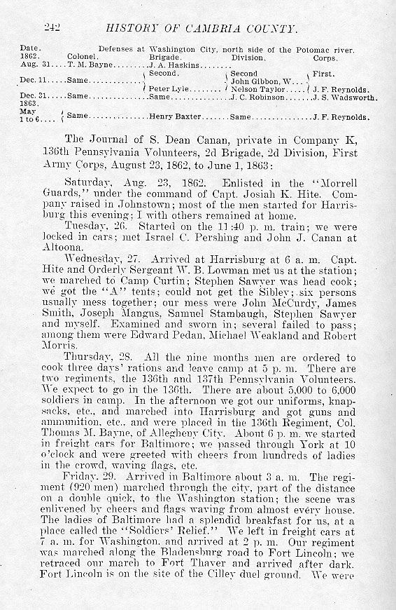 The Journal of S. Dean Canan, private in Company K, 136th Pennsylvania Volunteers, 2d Brigade, 2d Division, First Army Corps, August 23, 1862, to June 1, 1863: Saturday, Aug. 23, 1862. Enlisted in the “Morrell Guards,” under the command of Capt. Josiah K. Hite. Company raised in Johnstown; most of the men started for Harrisburg this evening; I with others remained at home. Tuesday, 26. Started on the 11:40 p. m. train; we were locked in cars; met Israel C. Pershing and John J. Canan at Altoona. Wednesday, 27. Arrived at Harrisburg at 6 a. m. Capt. Hite and Orderly Sergeant W. B. Lowman met us at the station; we marched to Camp Curtin; Stephen Sawyer was head cook; we got the “A” tents; could not get the Sibley; six persons usually mess together; our mess were John McCurdy, James Smith, Joseph Mangus, Samuel Stambaugh, Stephen Sawyer and myself. Examined and sworn in; several failed to pass; among them were Edward Pedan, Michael Weakland and Robert Morris. Thursday, 28: All the nine months men are ordered to cook three days' rations and leave camp at 5 p. m. There are two regiments, the 136th and 137th Pennsylvania Volunteers. We expect to go in the 136th. There are about 5,000 to 6,000 soldiers in camp. In the afternoon we got our uniforms, knapsacks, etc., and marched into Harrisburg and got guns and ammunition, etc. and were placed in the 136th Regiment, Col. Thomas M. Bayne, of Allegheny City. About 6 p. m. we started in freight cars for Baltimore; we passed through York at 10 o'clock and were greeted with cheers from hundreds of ladies in the crowd, waving flags, etc. Friday, 29. Arrived in Baltimore about 3 a. m. The regiment (920 men) marched through the city, part of the distance on a double quick, to the Washington station; the scene was enlivened by cheers and flags waving from almost every house. The ladies of Baltimore had a splendid breakfast for us, at a place called the “Soldiers' Relief.” We left in freight cars at 7 a. m. for Washington, and arrived at 2 p. m. Our regiment was marched along the Blandensburg road to Fort Lincoln; we replaced our march to Fort Thayer and arrived after dark. Fort Lincoln is on the site of the Cilley duel ground. We were |