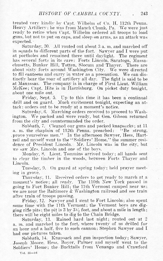 treated very kindly by Capt. Wilhelm of Co. H. 112th Penna. Heavy Artillery: he was from Mauch Chunk, Pa. We were just ready to retire when Capt. Wilhelm ordered all troops to load guns, but not to put on caps, and sleep on arms, as an attack was expected. Saturday, 30. All routed out about 3 a. m. and marched off in squads to different parts of the fort. Sawyer and I were put at portholes and remained there until daylight. The regiment has several forts in its care; Forts Lincoln, Saratoga, Massachusetts, Bunker Hill, Totten, Slocum and Thayer. There are about sixty forts around Washington City. We were directed to fill canteens and carry in water as a precaution. We can distinctly hear the roar of artillery all day. The fight is said to be at Manassas. The company is in charge of First Lieut. William McKee; Capt. Hite is in Harrisburg. On picket duty tonight, about one mile out. Friday, Sept. 5. Up to this time it has been a continual drill and on guard. Much excitement tonight, expecting an attack; orders out to be ready at a moment's notice. Saturday, 6. Marching orders received to proceed to Washington. We packed and were ready, but Gen. Gibson returned from the city and countermanded the order. Sabbath, 7. Cleaned our guns and packed knapsacks; at 11 a. m. the chaplain of 112th Penna. preached: “Be strong, prove yourselves men.” In the afternoon Sawyer, Hess, Hartzell and myself went to the “Soldiers' Home,” the summer residence of President Lincoln. Mr. Lincoln was in the city, but we saw Mrs. Lincoln and one of the boys. Monday, 8. Lieut. Tommins arrived today; all hands sent to clear the timber in the woods, between Forts Thayer and Lincoln. Tuesday, 9. On guard at spring today; held prayer meeting in grove. Thursday, 11. Received orders to get ready to march at a moment's notice; all ready. The 110th New York passed in going to Fort Bunker Hill; the 11th Vermont camped near us; we are near the Baltimore & Washington railroad and see train after train of troops passing. Friday, 12. Sawyer and I went to Fort Lincoln; also spent some time with the 11th Vermont; the Vermont boys are digging rifle pits; the pit is 3 by 3 ˝ feet, and about a mile in length; there will be eight miles to dig to the Chain Bridge. Saturday, 13. Rained hard last night; routed out at 2 a. m. and marched to the fort, where twenty of us drilled for an hour and a half, five to each cannon; Stephen Sawyer and I had our pictures taken. Sabbath, 14. Knapsack and gun inspection today; Sawyer, Joseph Moore, Hess, Boyer, Palmer and myself went to the Soldiers' Home; the Bucktils from Venago and Crawford |